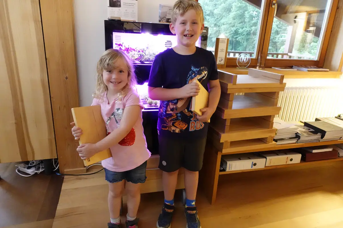 Wir überreichen diese in der Hoffnung, dass Kinder nach der Führung durch unser Gelände, Werkstatt und Ausstellung ein Gespür dafür bekommen, wie man aus Bäumen der Hersbrucker Alb Möbel herstellt. Das sind nach unserer Überzeugung wertvolle Sinn-Zusammenhänge, die auch einigen Eltern nicht ganz vertraut sind. Wir wollen auf diesem Weg Verständnis für und Freude am Handwerk fördern, denn wir brauchen auch in der nächsten Generation Menschen, die nicht nur am Computer sitzen, sondern wertvolles Holz in die Hand nehmen und daraus echte Werte schaffen.