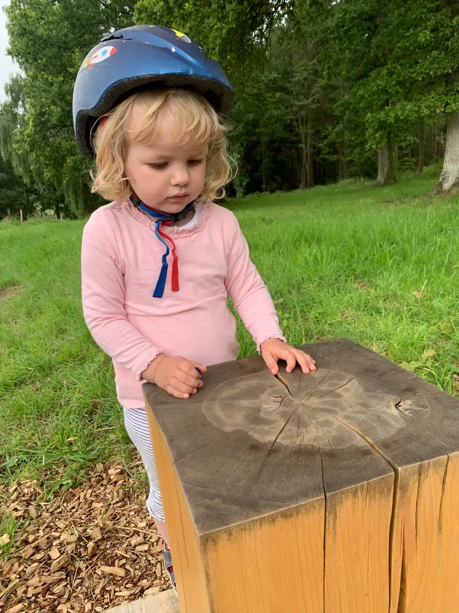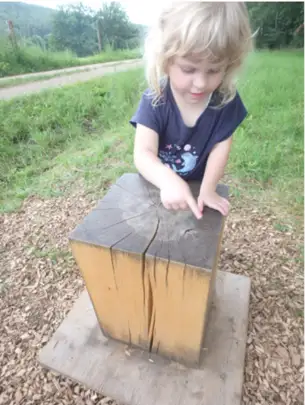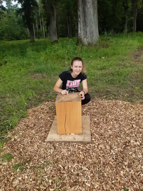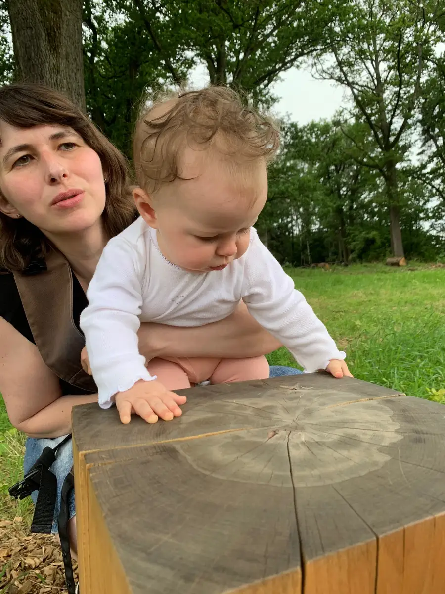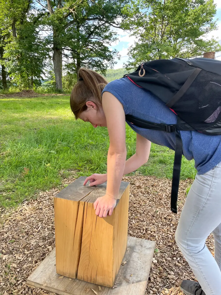 Amina zählt die Jahresringe unseres Massivhockers