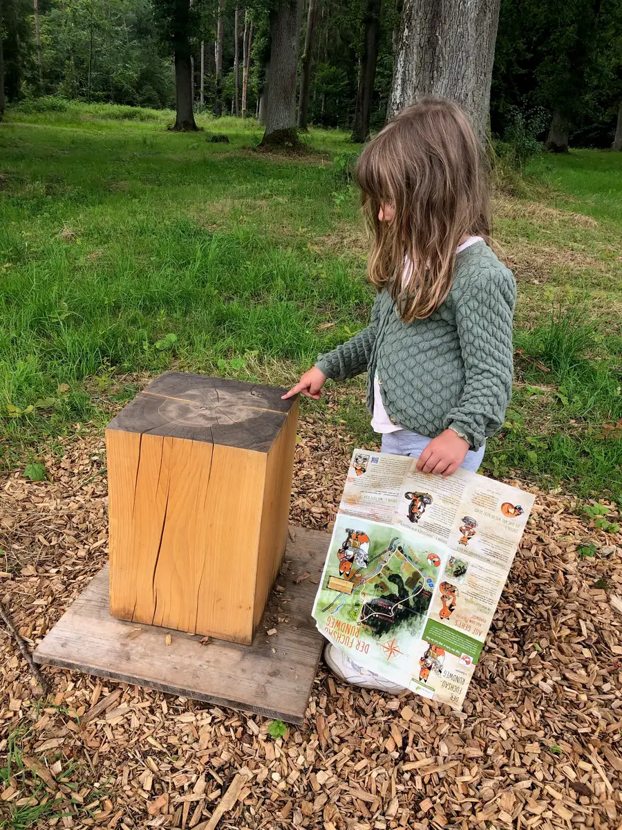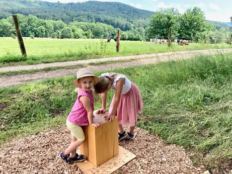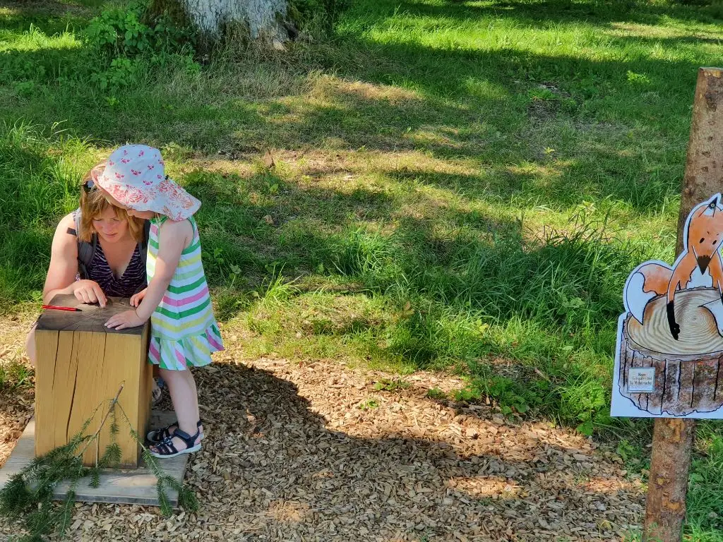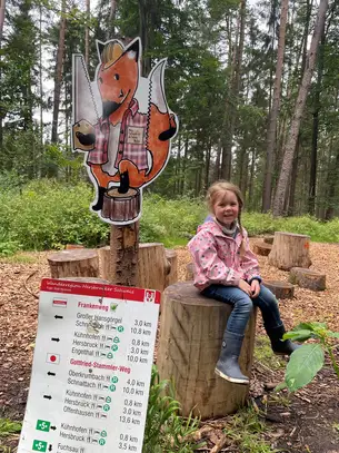 Auf dem liebevoll gestalteten Fuchsau-Rundweg bei Kühnhofen können Kinder die Natur auf etwa 3,7 km Länge spielerisch entdecken. Sei es beim Durchwaten eines seichten Bachbetts oder beim Erraten von Vogelstimmen, die über einen QR-Code mit dem Smartphone abgespielt werden können. An jeder der 14 Stationen erwartet euch einer der von Ute Scharrer wundervoll gezeichneten Füchse und stellt euch etwas Neues und Interessantes vor. Starten könnt ihr am besten bei der Gaststätte Fuchsau. Dort gibt es jede Menge Parkplätze. Euer Wanderzeichen ist ein runder Sticker mit dem kleinen Fuchs. Uns hat dieser ruhige und entspannte Weg heute richtig gut gefallen.