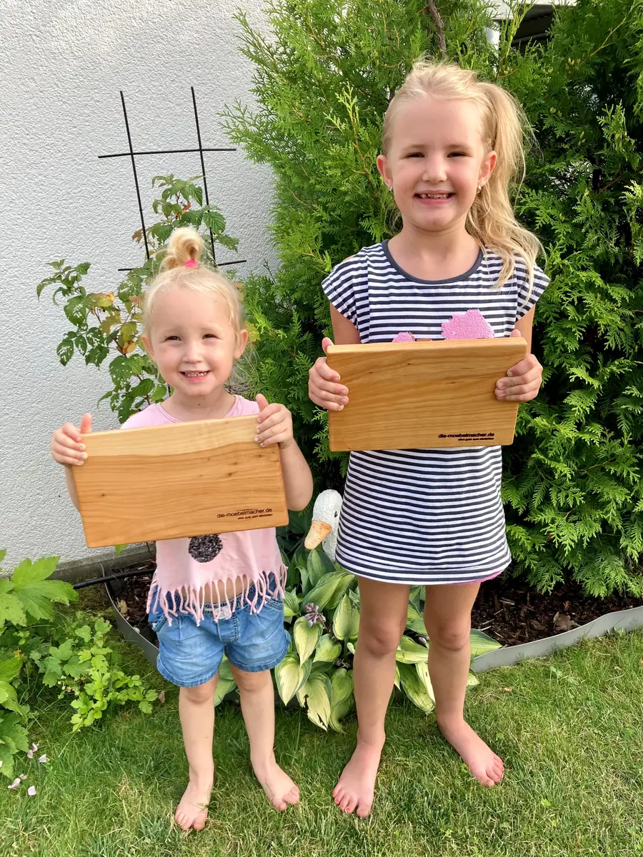 Einfach Fotos mit den Kindern machen und an uns schicken: info@die-moebelmacher.de. Wir belohnen mit einem Brotzeitbrettchen und – wenn Zeit ist – einer kleinen Führung durch unser Gelände