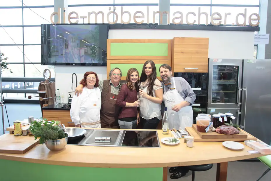 Der Kirschbaum aus Lilling, die Arbeitsplatte aus Laborkeramik von Systemceram, die Geräte von Miele: Der geprüfte Ernährungsexperte und Küchenspezialist herwig Danzer stellt während der Kochshows mit den Spitzenköchinnen auch die grüne Küche der Möbelmacher vor. Mit Druckdampfgarer, Induktionswok, Kompaktbackofen und dem automatisch schließenden Oberschrank. Und mit grünem Leder, welches zärtlich zu den Knien ist ...