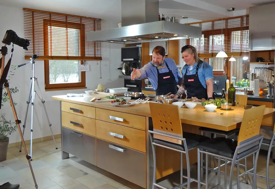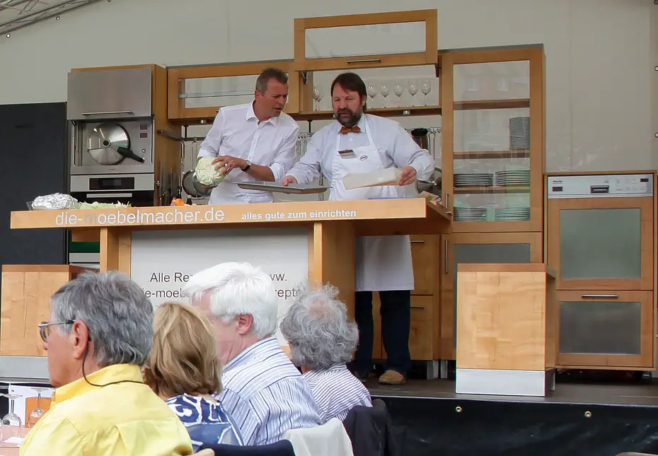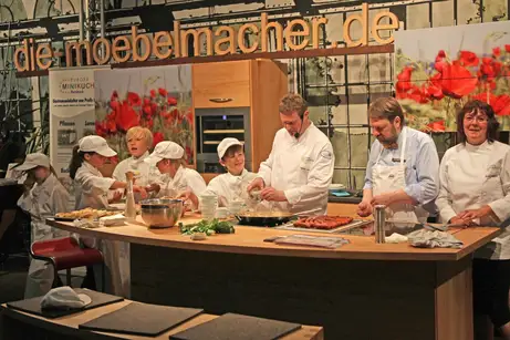 Im Jahr 2000 entstanden unsere Kochshcows in Zusammenarbeit mit dem Bayerischen Rundfunk, weil wir zeigen wollten, dass Massivholzküchen nicht nur schön sind und sich angenehm anfühlen, sondern auch ebenso funktionale wie langlebige Werkzeuge zum Kochen. Die praktische Vorführung mit Profiköchen liefert dafür den Beweis.