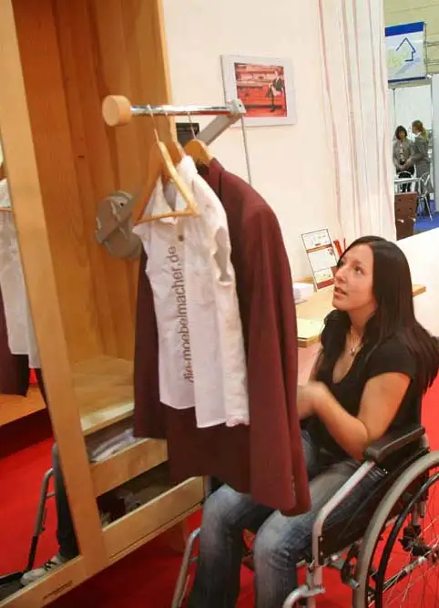 Wir haben einen Rollstuhl dabei, in dem Sie selbst mal testen können, welche Vorteile die vielen Kleinigkeiten der Barrierefreiheit bieten. Die Unterfahrbarkeit aller Möbel, die herunterklappbare Kleiderstange oder der gut erreichbare Kühlschrank.