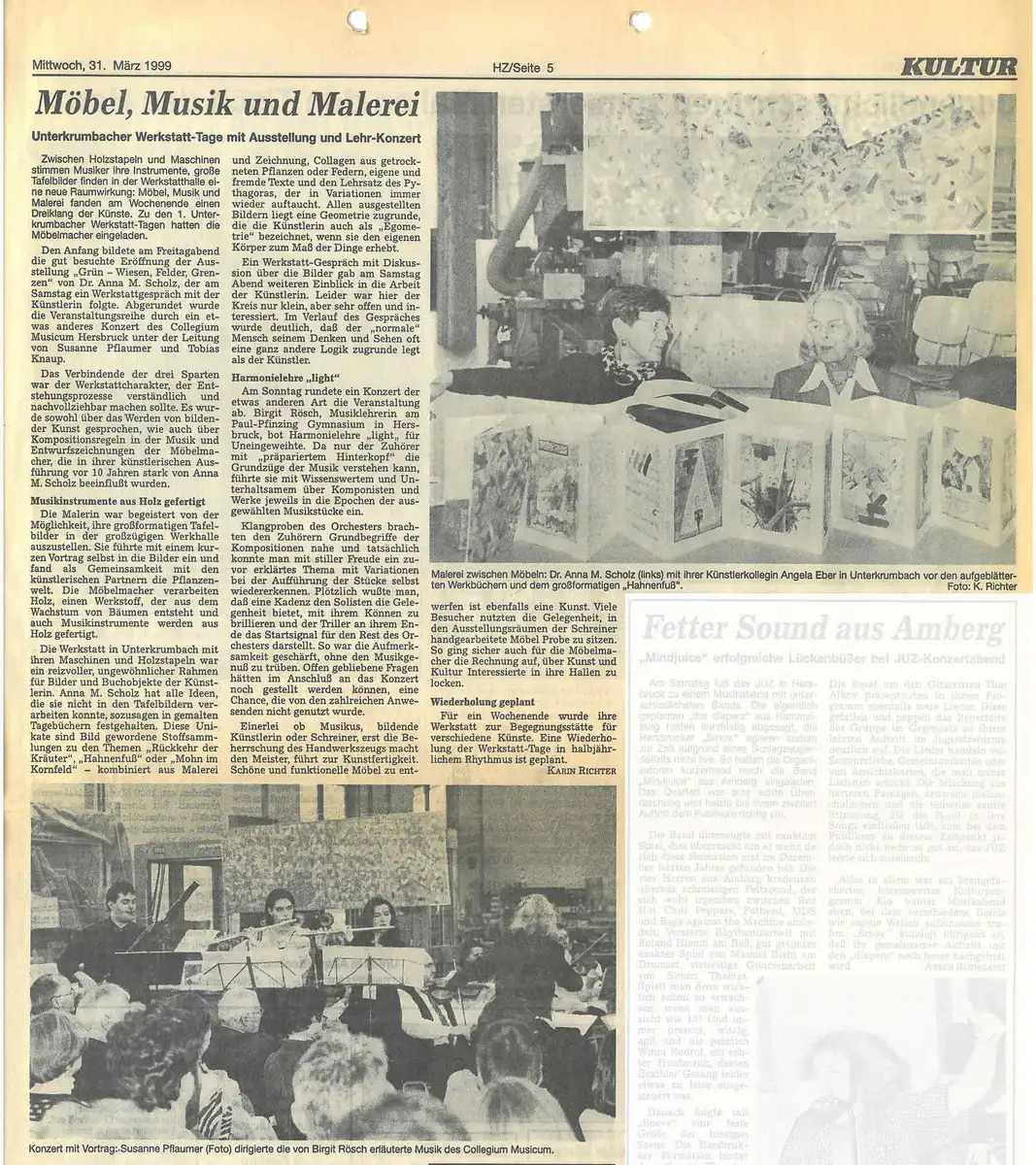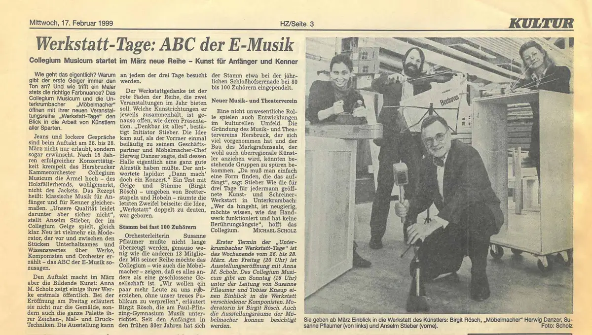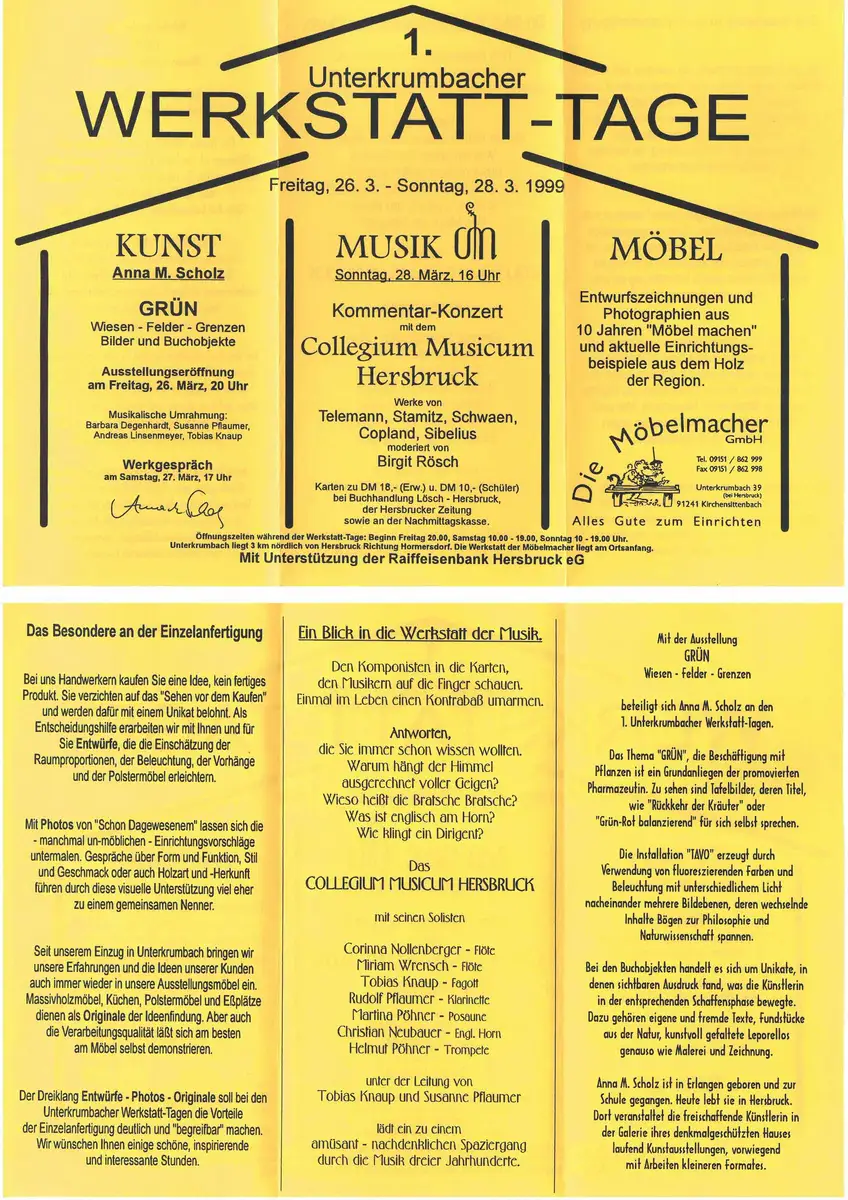 Das Collegium Musicum und Anna M. Scholz veranstalten gemeinsam mit uns Möbelmachern die ersten Unterkrumbacher Werkstatt-Tage vom 26.-28.März 1999.