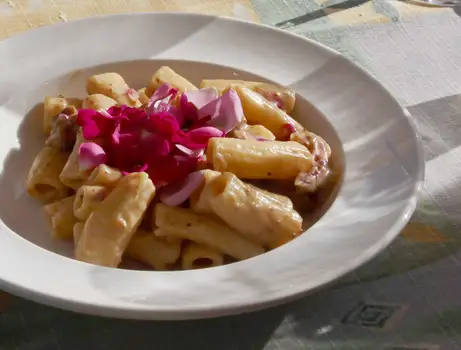Nudeln in Rosen-Sahne-Sauce mit Feigen und frischen Rosenblüten ist nur ein köstliches Gericht, das unsere Gäste erwartet