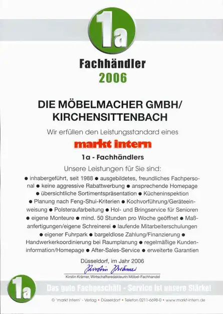 Die Fachleute von Markt Intern haben uns nach Prüfung aller Kriterien zum 1a Küchen-Fachhändler gekürt. Damit sind wir der einzige Hersteller und Verkäufer von Massivholzküchen, der diese Auszeichnung bisher bekommen hat.