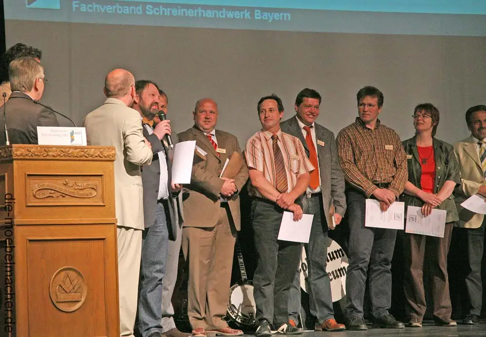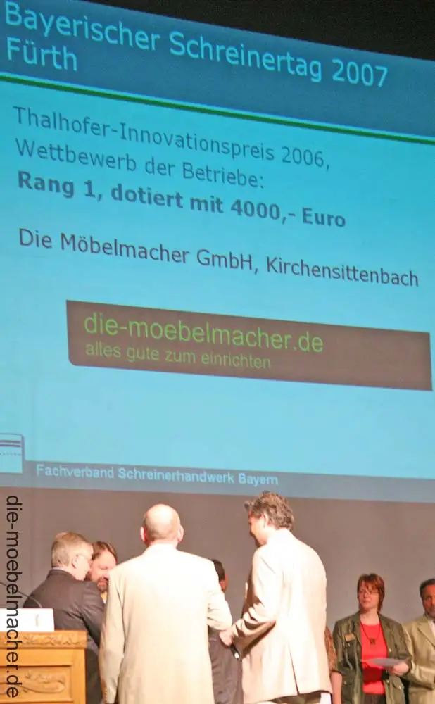 Am 4. Mai empfingen wir am Schreinertag 2007 in der Fürther Stadthalle den mit 4000 Euro dotierten Thalhoferpreis aus der Hand des Stifters garselbst. Scheck, Skulptur aus Nussbaum und Urkunde nahmen wir dankbar entgegen und freuten uns über eine Auszeichnung, die die Innovationskraft im bayerischen Schreinerhandwerk belohnt.