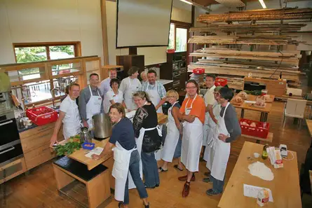 UNTERKRUMBACH – Ihr 20-jähriges Jubiläum begannen die Möbelmacher aus Unterkrumbach mit einem Kochworkshop mit anschließendem Heimat-Diner. Am Samstag wurde die erste Wildkräuterweißwurst mit selbst gebackenen Brezen vorgestellt, den Kuchen zum fair gehandelten Kaffee hatten die eigenen Kunden gebacken, die zusammen mit Freunden und Mitarbeitern am Abend eine Riesenparty mit Möma-Kapelle und Disco feierten. Das ganze Team samt Partnern, von den Lehrlingen über die Gesellen und Meister bis zu den beiden Geschäftsführern Gunther Münzenberg und Herwig Danzer, kochte, bediente, spülte, zapfte, musizierte und referierte und zeigte damit eindrucksvoll, dass sie nicht nur Möbel machen, sondern auch phantasievoll organisieren können.