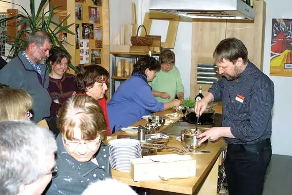 Es gibt viele Möglichkeiten bei oder mit uns zu kochen. Das machen wir erstens, weil wir als geprüfte Ernährungsexperten auch selbst gerne den Kochlöffel (aus Edelstahl von Rösle) schwingen und zweitens, weil das die beste Möglichkeit ist, die Menschen von den Vorteilen der Massivholzküche aus Unterkrumbach zu überzeugen (und sie von den Einflüsterungen des konventionellen Küchenhandels und der culinarischen Cousine zu befreien).