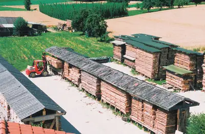 Kurz vor der Verarbeitung kommen die Stapel in die Trockenkammer. Dort wird das bestellte Material auf die niedrige Luftfeuchtigkeit in beheizten Räumen vorbereitet um die Probleme des "Verziehens" weitgehend auszuschließen. Trotzdem wird Massivholz, wie auch der Schreiner selbst, immer "arbeiten."