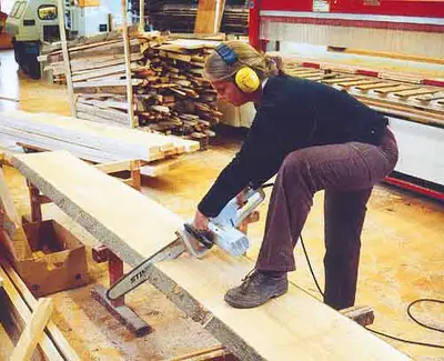 Simone beim Ablängen mit der Kettensäge.