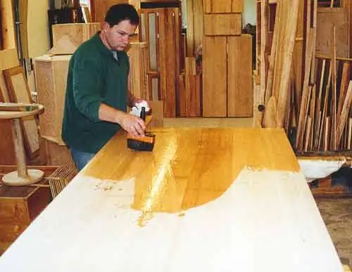 Der tief eindringende Leinölanteil härtet das Holz beim Trocknen von innen. Nach dem langwierigen Trocknungsvorgang und dem Zwischenschleifen werden ein zweiter, und - je nach Verwendungs-zweck - auch noch mehrere Ölaufträge einpoliert.