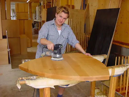 Die Kanten werden nach Kundenwunsch mit der Oberfräse gerundet und zum Schluss zunächst maschinell und dann per Hand geschliffen.
