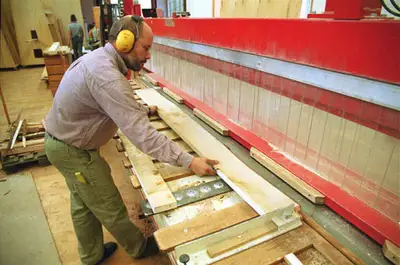 Das Besäumen und das Auswählen der geeigneten Holzbreiten ist für die Ästhetik unserer Möbel so entscheidend, dass sich sogar Besuchergruppen immer wieder dafür interessieren.