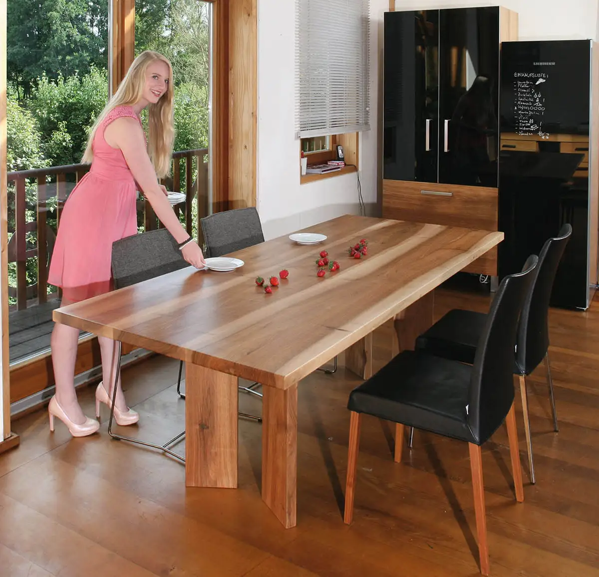 An diesem Massivholztisch aus fränkischem Nussbaum reservieren wir gerne die Plätze für Sie