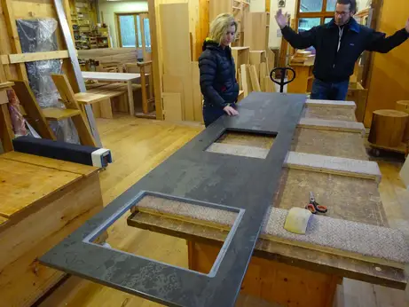 - einen Nussbaumtisch und einen nur halbfertigen in Buche