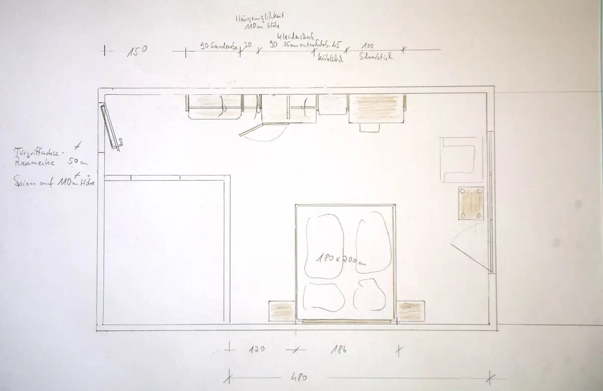 Nach allem, was wir an DIN-Normen durchgearbeitet haben, müsste dieses Hotelzimmer für Rollstuhlfahrer eigentlich funktionieren. Wir freuen uns aber wirklich, über jeden Verbesserungsvorschlag, wir haben unsere Massivholzmöbel mit L-Winkeln so an der Wand befestigt, dass alle großzügig unterfahrbar sind (35 cm), außer dem Bett, bei dem nach unserer Überzeugung 25 cm genügen müssten, vor allem, wenn zur Terassentür über 150 cm Platz sind. Denn wir befürchten, dass das Zimmer zu viel an Flair verliert, oder zu viel an Pflege erinnert, wenn wir das Bett noch höher machen. Das mag in Einzelfällen sinnvoll sein, für ein Musterzimmer legen wir aber Wert darauf, dass es auch eine angenehme Atmosphäre bietet.