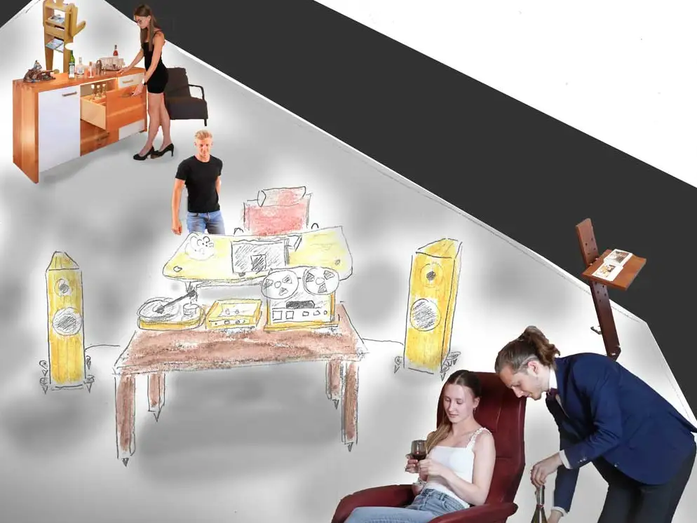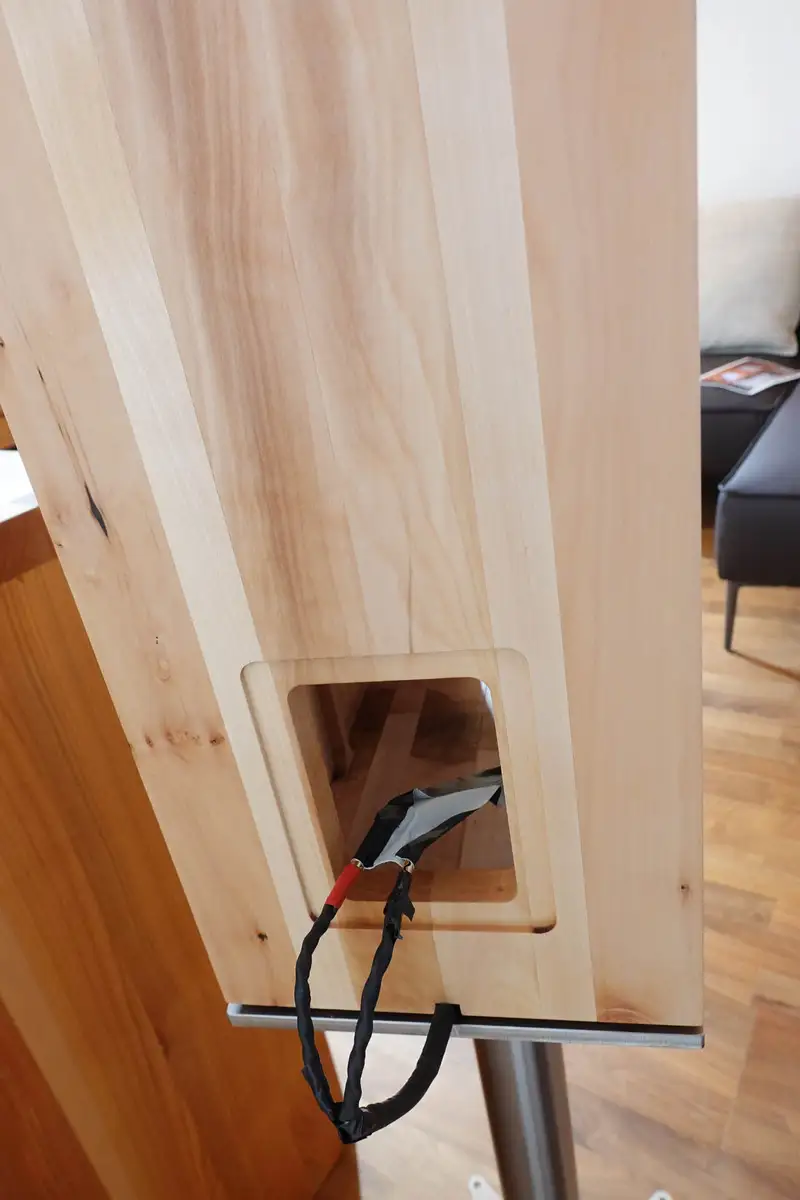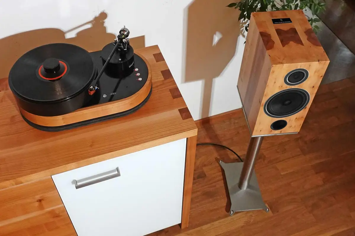 Julian Lorenzi aus Engelthal, glücklicher Besitzer einer Möbelmacher-Elsbeerenküche der Möbelmacher, ist Hersteller von Highend-Plattenspielern seiner Marke AMG (Analog-Manufaktur-Germany). Die Möbelmacher fertigen für diese Einlegerahmen aus Massivholz und besuchten den Kunden im Mai 2022 auf der Highend-Hifi-Messe in München. Beim Rundgang entdeckten sie die Wiener Lautsprechermanufaktur, einen Hersteller von klanggewaltigen Massivholz-Lautsprechern. Auf die Frage nach einer möglichen Zusammenarbeit bat CEO Andreas Steiner sie spontan darum, die benötigten Lautsprecher doch selbst herzustellen und bestellte selbst gleich ein Paar mit.