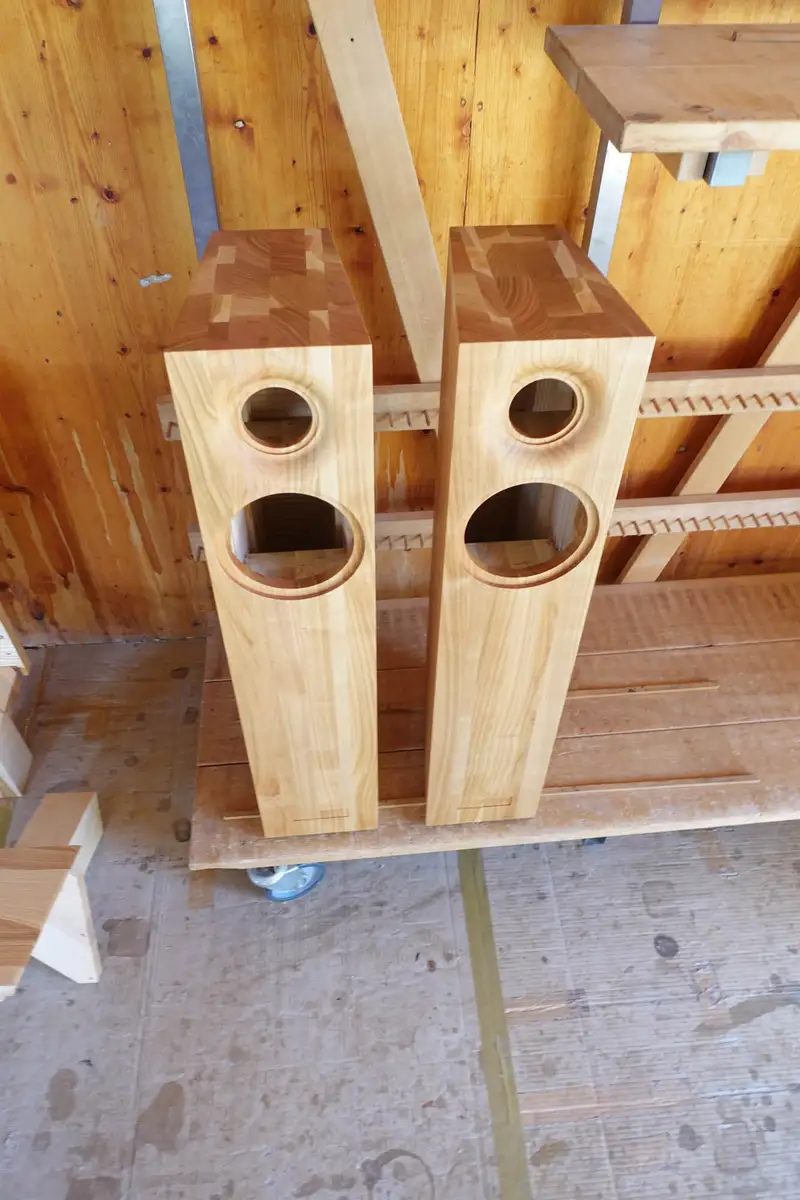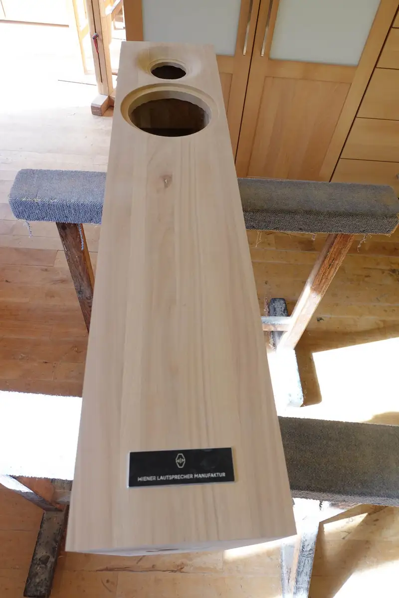 Sophia Wagner war die ausführende Meisterin und hat zusammen mit ihren Kolleginnen Christiane und Meret (daran waren zufällig wirklich nur Frauen beteiligt) die Boxen vom rohen Brett bis zum fertigen Gehäuse verwirklicht. Dann hat Andreas Steiner die Boxen selbst abgeholt und nach Wien zu Martin gefahren, auf dass aus den schönen Holzskulpturen echte Klangerlebnisse werden mögen, was gelang.