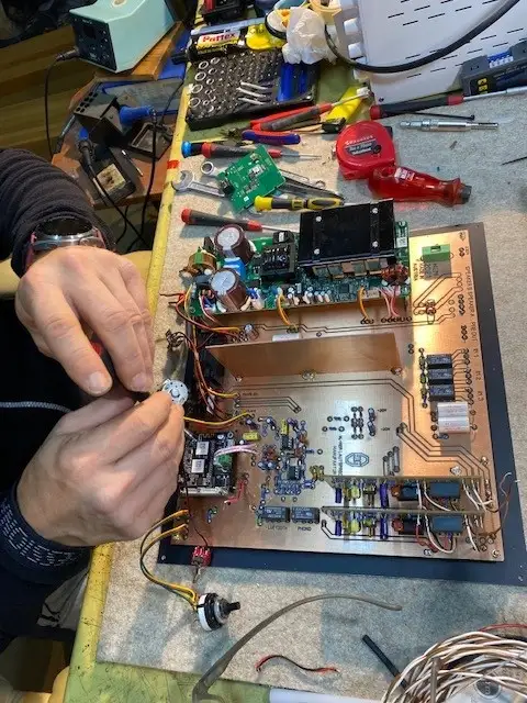 Alles ist bei unserer Hifianlage Handarbeit. Martin Schützenauer lötet den Phonoverstärker (und alles andere) in das Gerät Josef S. Denn leider haben nicht mehr alle Menschen einen Plattenspieler, weshalb er nur bei Bedarf dort eingebaut wird. Für junge Leute ist das wichtigste oft der Bluetooth-Zugang zu ihrem Streamingdienst und auch das kann Josef S hervorragend.