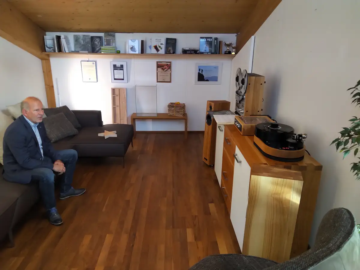 Carola und Julian Lorenzi haben sich für eine Massivholzküche aus Elsbeere entschieden (hier ist sie zu sehen), gleichzeitig verliebte sich herwig Danzer in die Plattenspieler von Julians Firma AMG (Analog-Manufaktur-Germany). Weil sich alle gut verstanden und Danzer schon als 14-jähriger Hififreak eine eigene Tonbandmaschine und Plattenspieler hatte, entstand der Wunsch, die Holzgehäuse für die Plattenspieler nachhaltig aus regionalem Holz in Unterkrumbach zu fertigen.