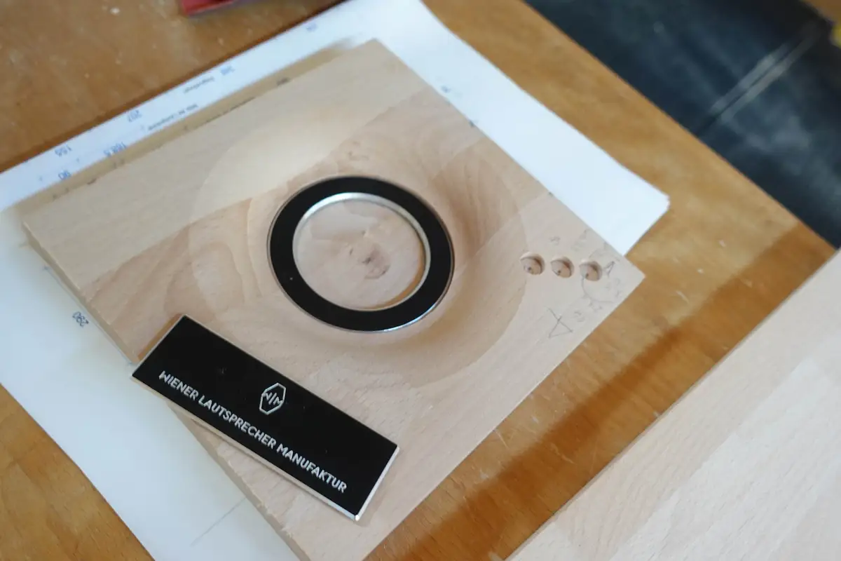 Frontfräsung für Hoch-, Mittel- und Hochtöner und das Firmenschild