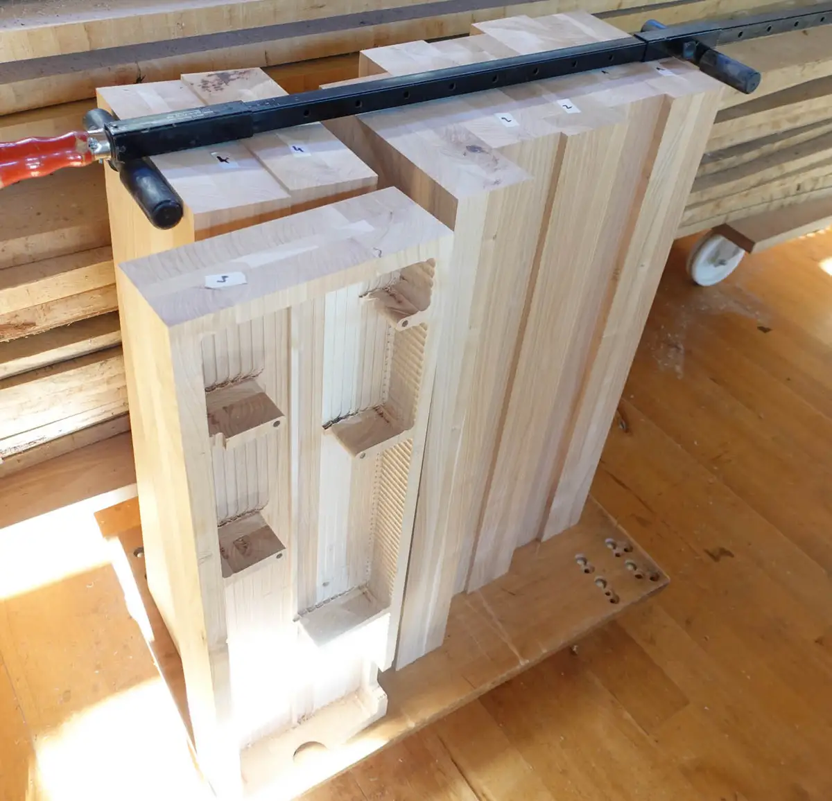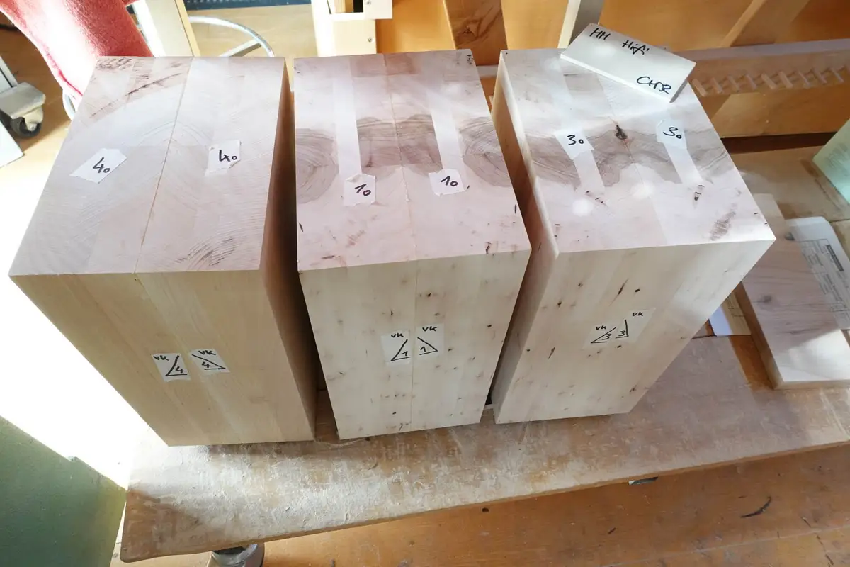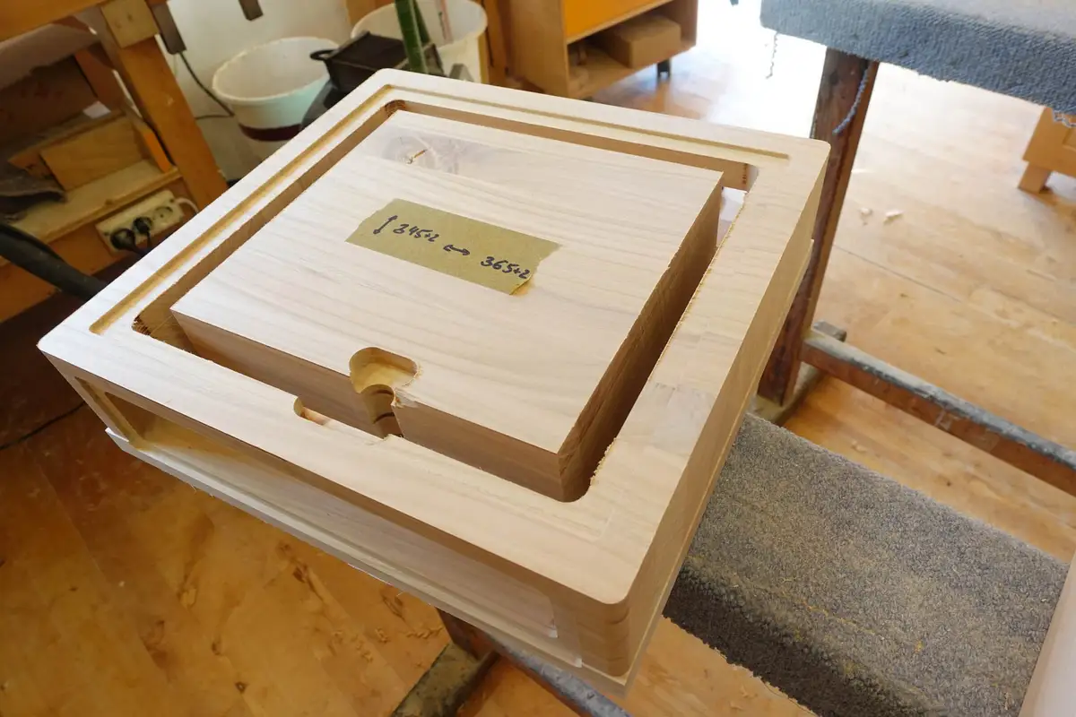 Die aus massivem Kirschbaum verleimten Blöcke werden zu halben Lautsprechern gefräste, die später zu einer ganzen Massivhlzbox verleimt wird