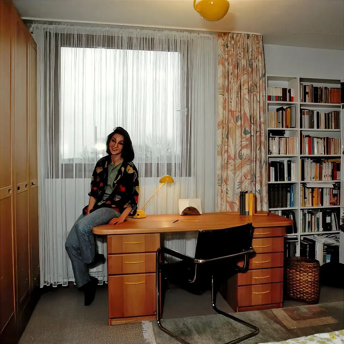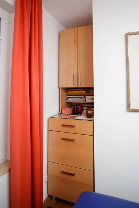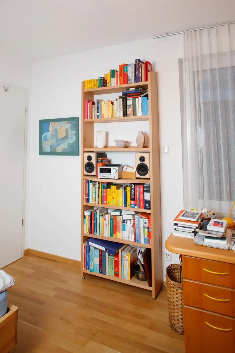 Herr Buchberger hat für seinen Arbeitgeber eine riesige, weltweit einzigartige Bibliothek von 300 000 Werken zum Thema Kunst auf 520 000 Werke erweitert und viele selbst – auch mit Unterstützung seiner Frau – geschrieben. Selbstverständlich müssen selbst in der kleineren Wohnung alle freien Plätze für Bücher eingerichtet werden. Im Schlafzimmer steht also eine Kombination aus Stauraum hinter Türen mit oben integriertem weniger tiefen Bücherregal und der Restplatz neben dem umgezogenen Schreibtisch (aus dem Jahr 1994, siehe weiter unten) mit gelben Griffen wurde natürlich auch noch für ein Regal verwendet. Dabei ist ein Fachboden etwas tiefer und elegant geschwungen für die Musikanlage ausgeführt.
