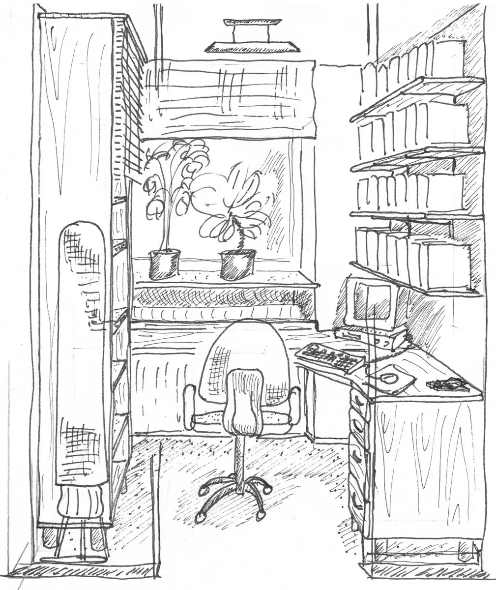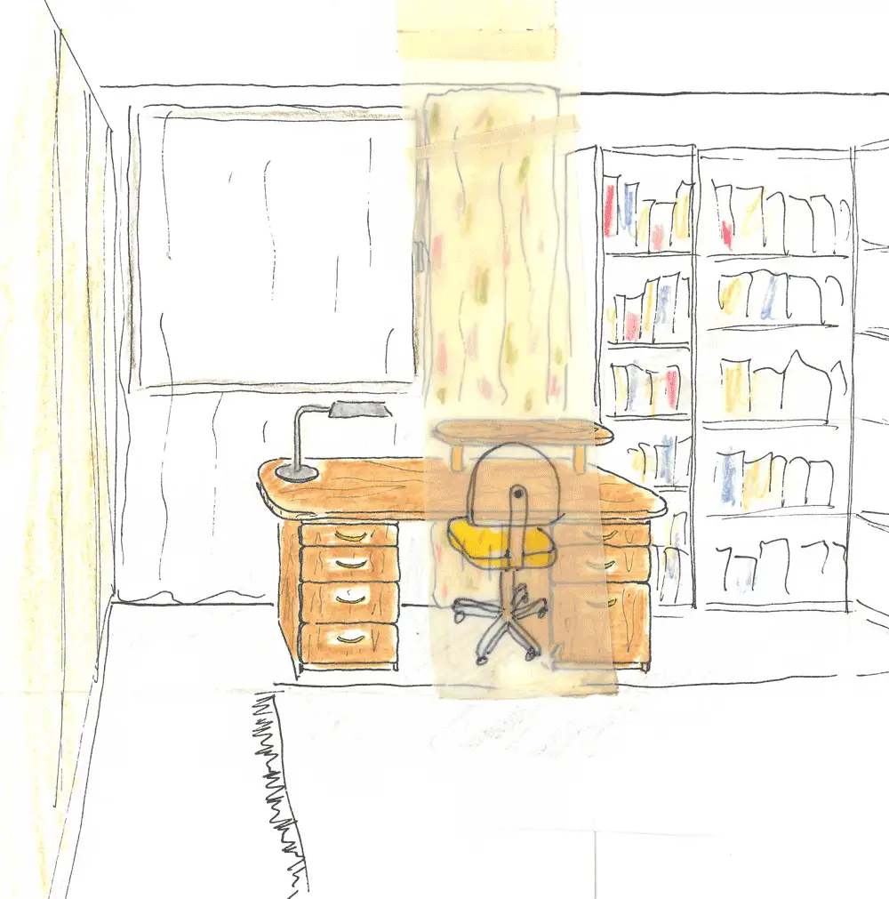 Noch ein Arbeitszimmer im winzigen Abstellraum, der auch ein Bügelbrett aufnehmen musste, von dem wir leider kein Foto mehr haben, aber die Zeichnung erklärt ja auch, was es werden sollte