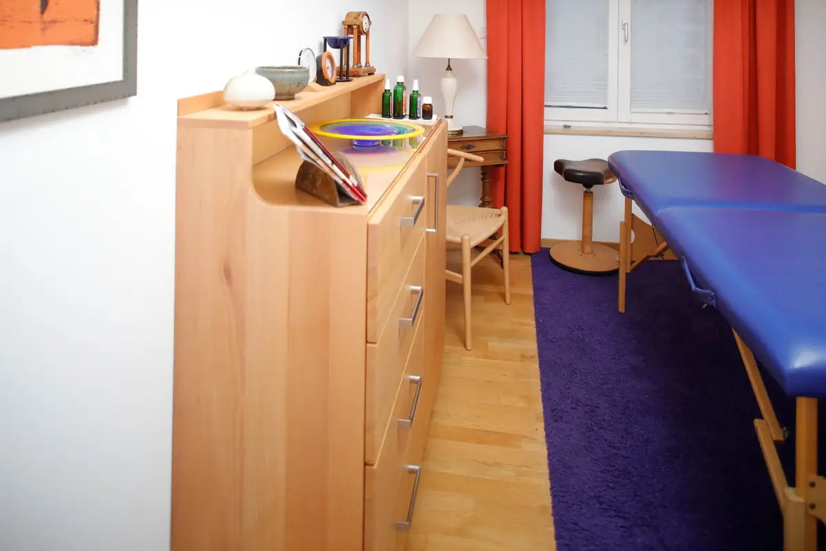 In der neuen Wohnung wurde ein Raum ganz der Massage ihrer Stammkunden gewidmet. Weil dabei sehr viel mit Öl gearbeitet wird, haben wir die Massivholzschränke auf der Oberseite mit Glasplatten abgedeckt, was sich bewährt hat.