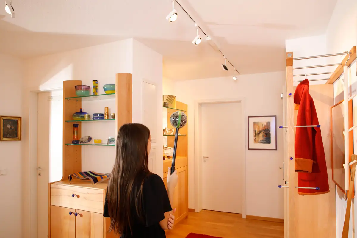 Die Garderobe im Flur besteht aus einem Schuhschrank mit Spiegeltür, einer Leiter und einer Stützsäule für dieselbe. Daran sind kleine Glaskügelchen in Edelstahlstäben integriert. Diese sind ein Symbol für die ewige Liebe zur Glaskunst der Familie, die man an vielen Exponaten erkennen kann und die wir weiter unten noch thematisieren werden. Praktikantin Natascha hängt Annes Jacke an den Bügel. Die Leiter ermöglicht das queere Hängen von Jacken und Mänteln (hat nichts mit dem Geschlecht zu tun). So benötigt die Garderobe nur die 40 cm Tiefe (je nach Schuhgröße) und muss nicht 60 cm tief werden, weil längs gehängte Jacken so viel Platz beanspruchen würden.