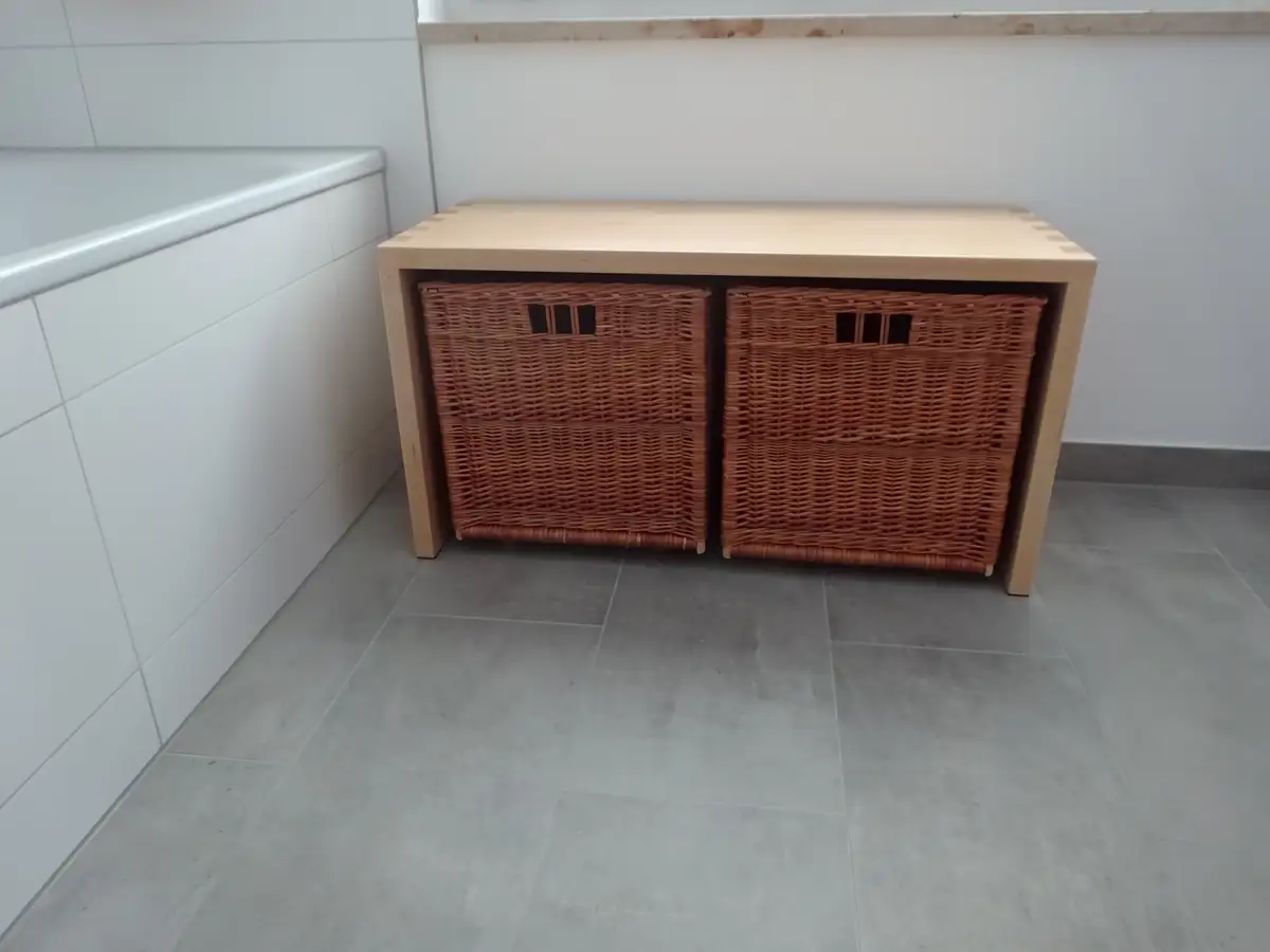 Flechtkörbe für die Wäsche unter dem gezinkten U-Hocker
