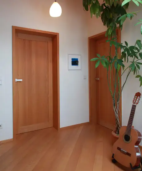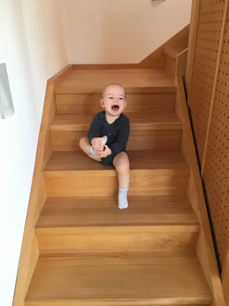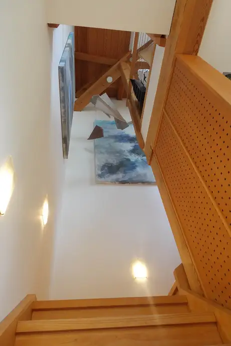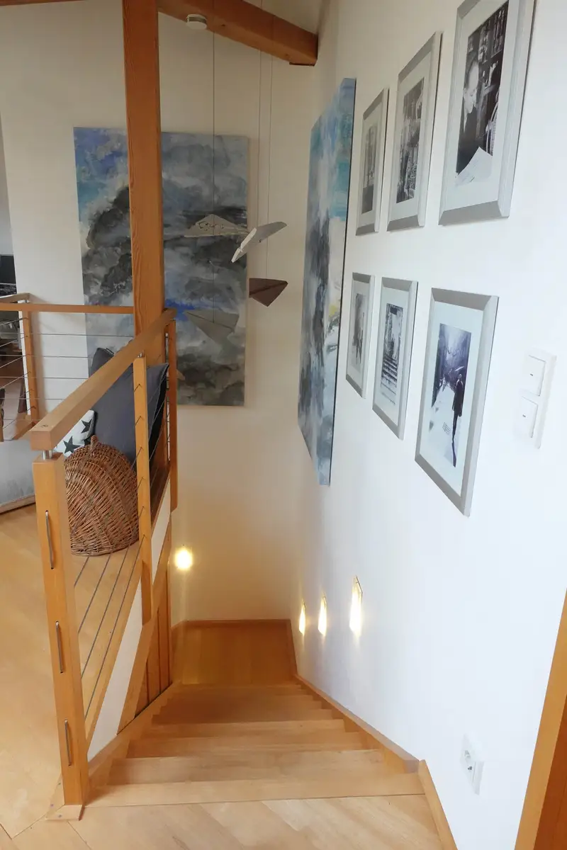Wir machen nur selten Treppen, aber wenn, dann mit voller Freude. Unsere dreht nach 5 Stufen und dem Absatz 90 Grad nach rechts und die restlichen 10 führen in die Galerie. Sie hat eine wunderbare Beleuchtung auf Kniehöhe, das Geländer ist das Bücherregal, das dank der Löcher in der Rückwand eigentlich leicht durchsichtig wäre, die durch die vielen Bücher leider verdeckt sind. Die Treppe führte uns 22 Jahre unfallfrei nach oben und vermutlich gleich oft nach unten und wir würden sie auch wieder als Wangentreppe aus reinem Massivholz konstruieren.