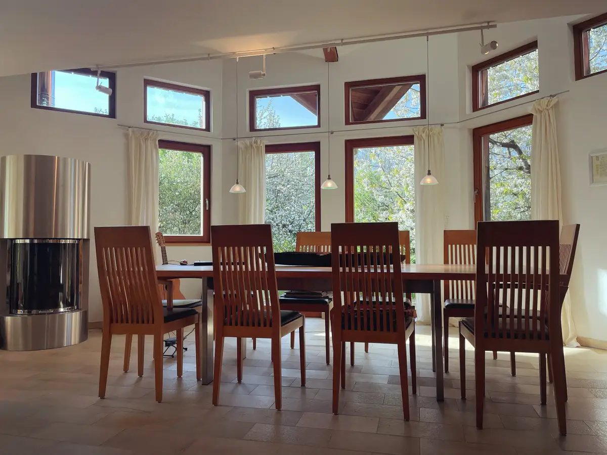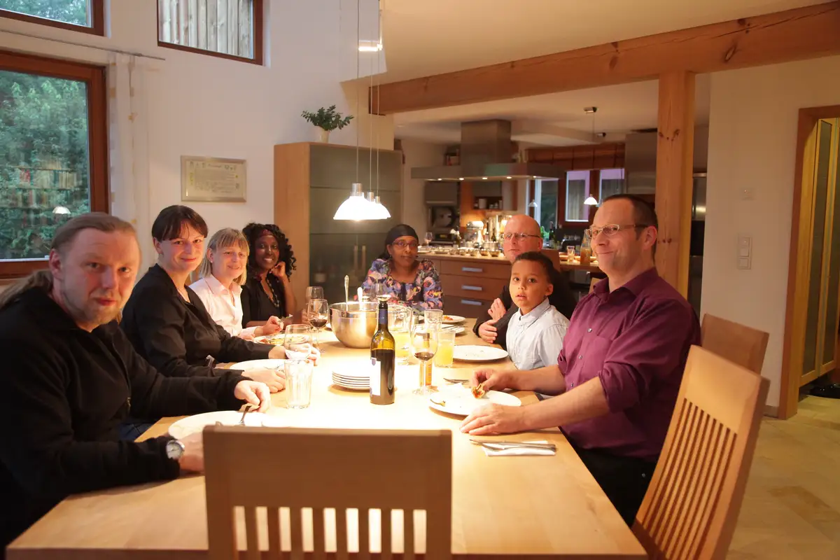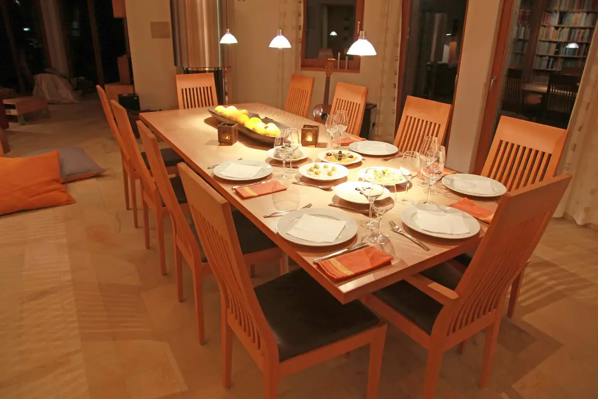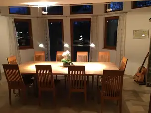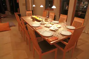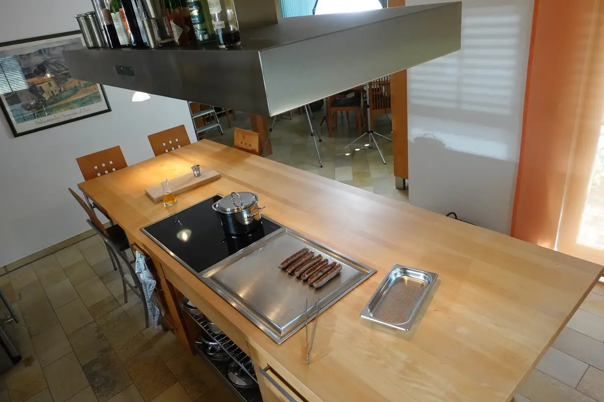 Im Esstisch sind einige Bretter mit Wimmerwuchs integriert, so heißt das bis heut noch nicht vollständig erklärbare Phänomen, dass Maserungen manchmal einen rhythmischen Verlauf nimmt. Getragen wird der von einem Edelstahlgestell, das von der Kochinsel inspiriert wurde. Er wurde 2024 mal wieder richtig nachgeölt, seitdem sind keine Gebrauchsspuren darauf zu erkennen. Der Tisch ist 270 mal 109 cm groß, daran stehen 10 Stühle, es passen aber auch 14 hin.
