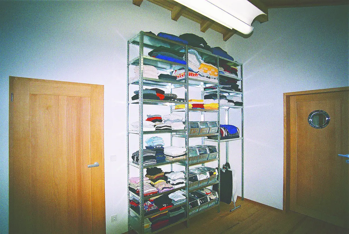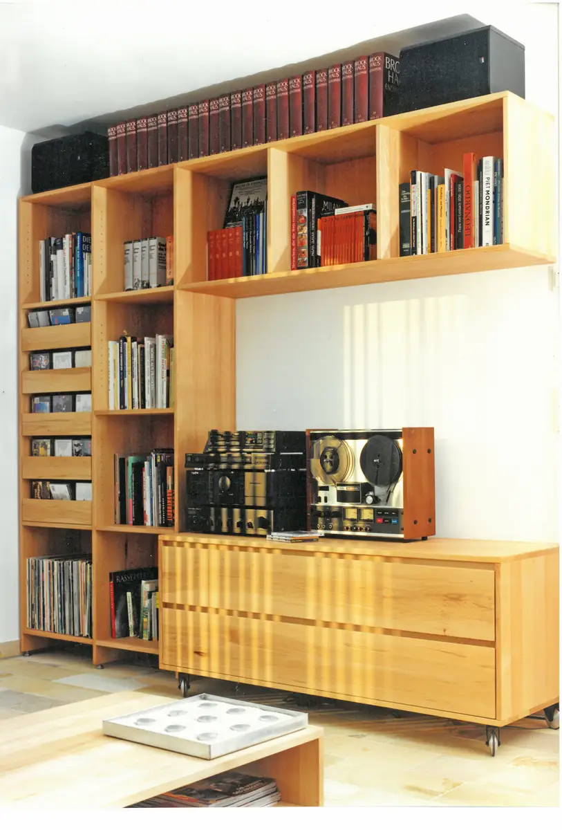Wenn Sie also die Möglichkeit haben, die Sachliteratur, die der Vermittlung von Wissen und Informationen dient, in tiefere Regale auszulagern, dann können Sie an alle andere Wände so schmale Regale stellen. Denn bei Bild- und Kunstbänden, Koch- und Bilderbüchern gibt es wesentlich mehr Formate, weshalb wir dort auch immer mit individuell einstellbaren Fachböden auf Lochreihen arbeiten.
