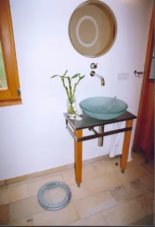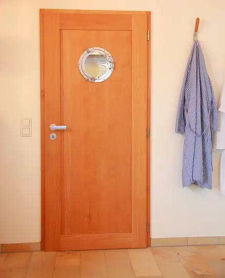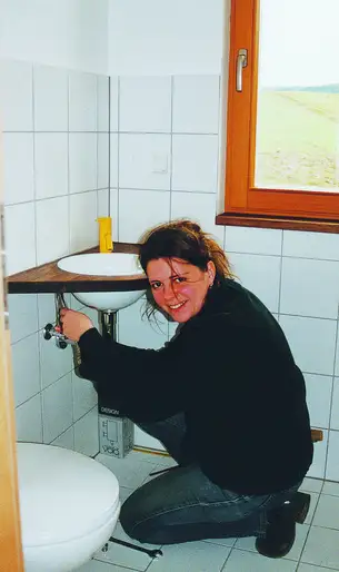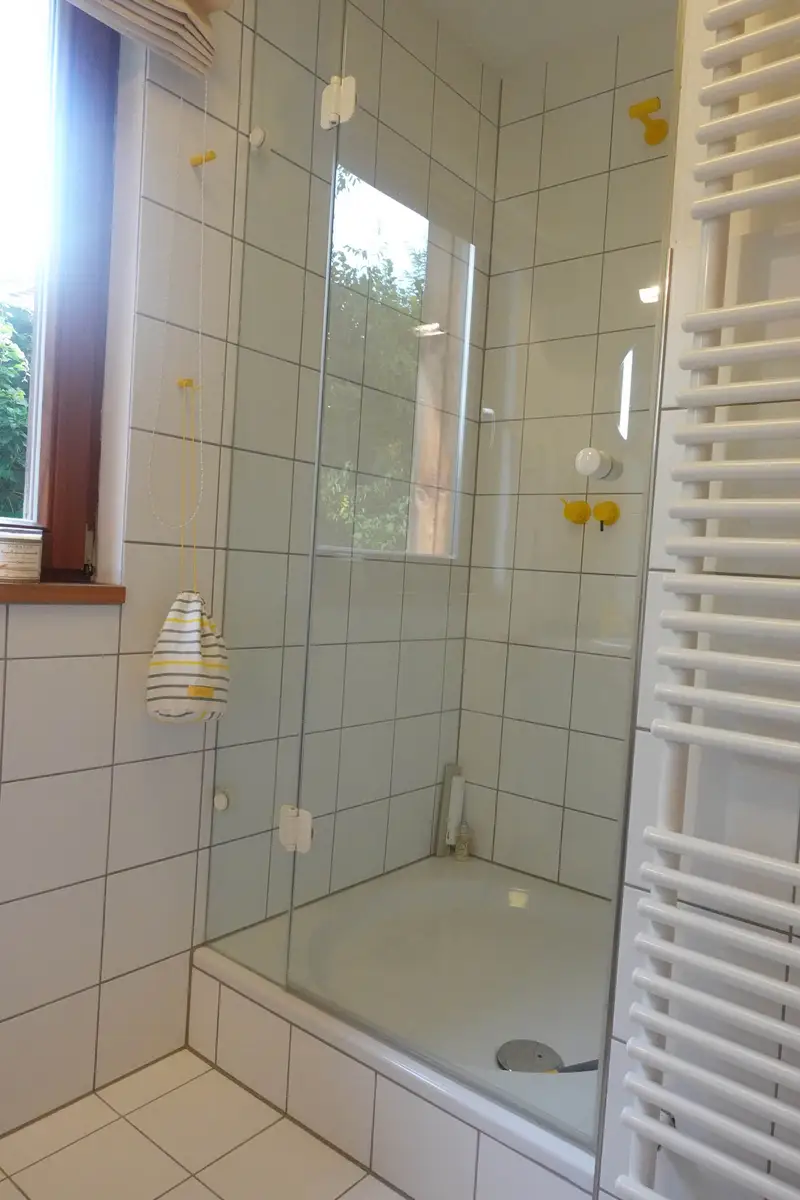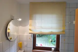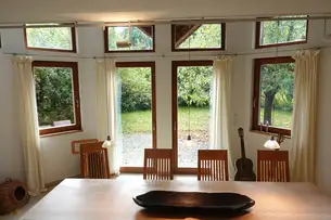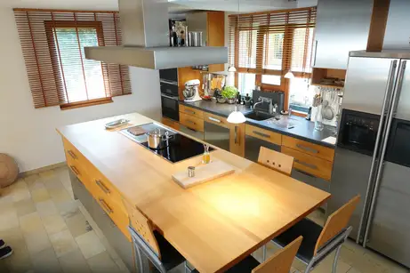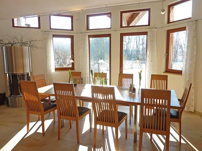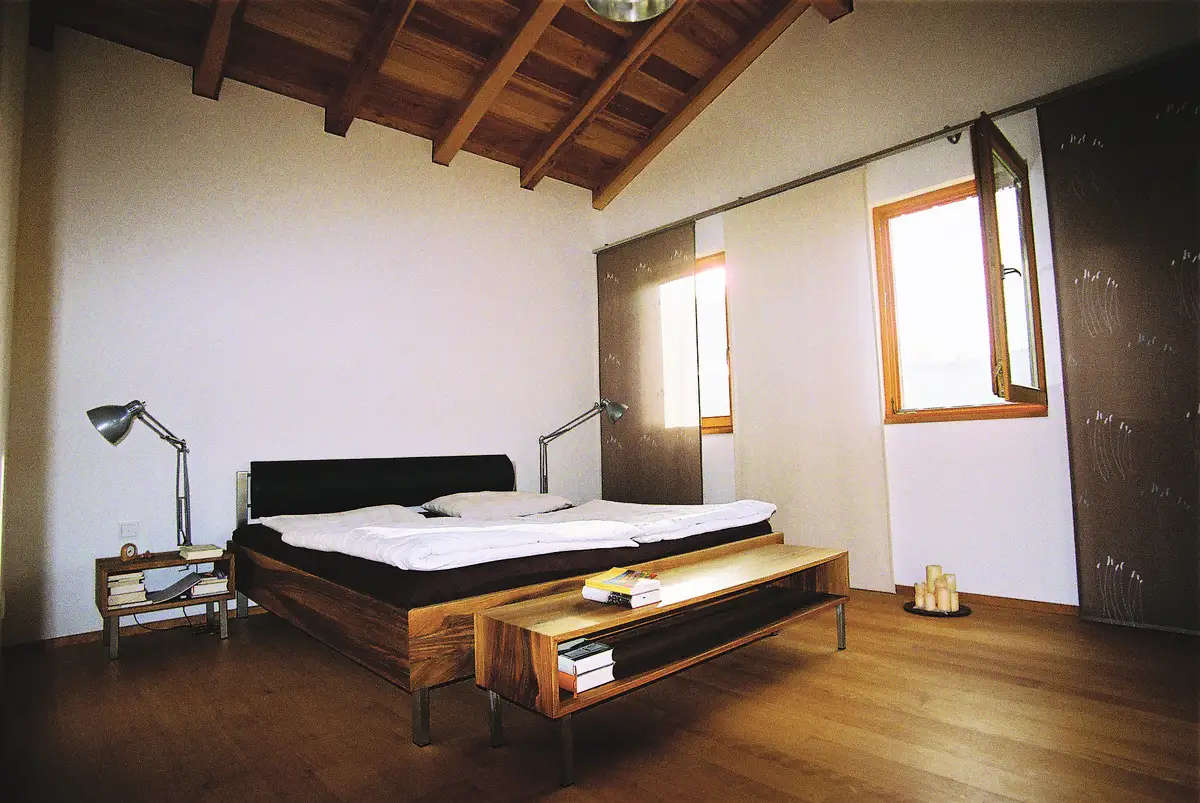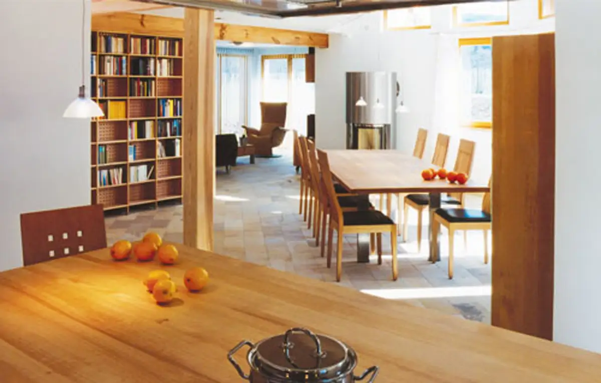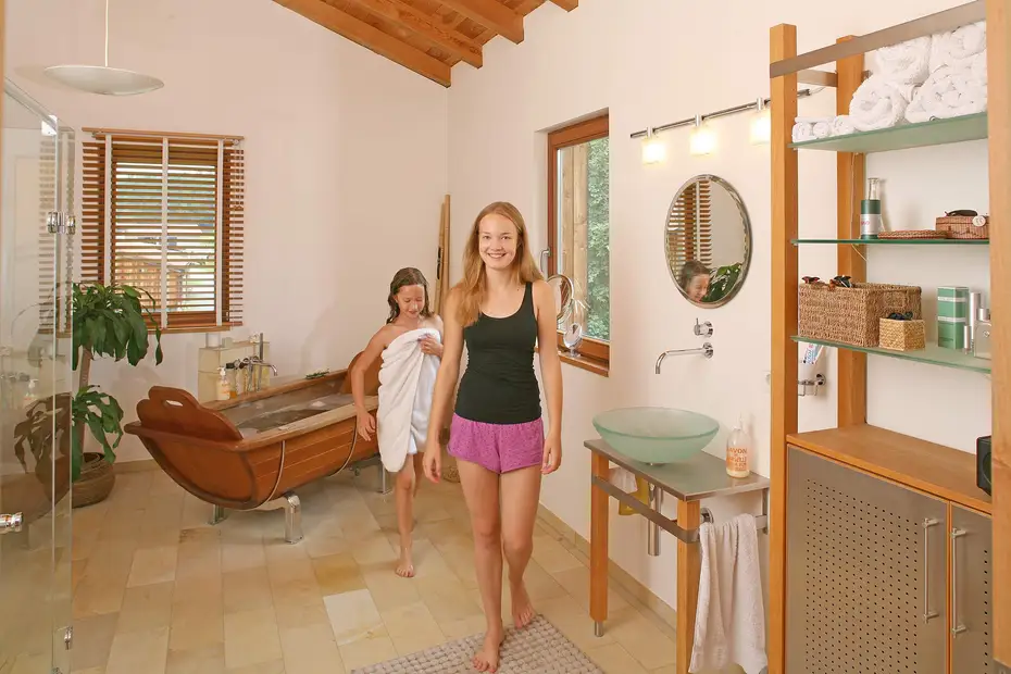 Das "Regionale Musterhaus" steht direkt neben der Möbelmacherhalle und wurde ausschließlich von Handwerkern und aus Materialien der Region gebaut. Gerne zeigen wir Ihnen auch das Badezimmer, das aus heimischer Buche mit Edelstahlwaschtisch und Lochblech in den Schrankfronten gestaltet wurde. Wir lieben die Holzbadewanne, die Solnofer Platten - sie bewähren sich auch in der Dusche - und die Armaturen von Vola.