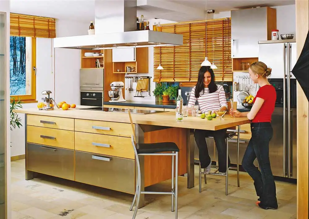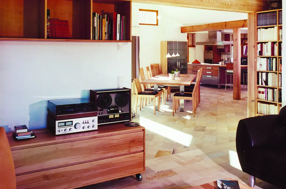 Die Kompletteinrichtung ist ausgehend von der Küche in Buche und Edelstahl gestaltet, das große Profil (10 × 40 mm), das die Kücheninsel trägt, ist das gleiche wie beim Tisch, und auch als Fuß unter dem Barschrank und sogar dem Couchtisch im Einsatz.