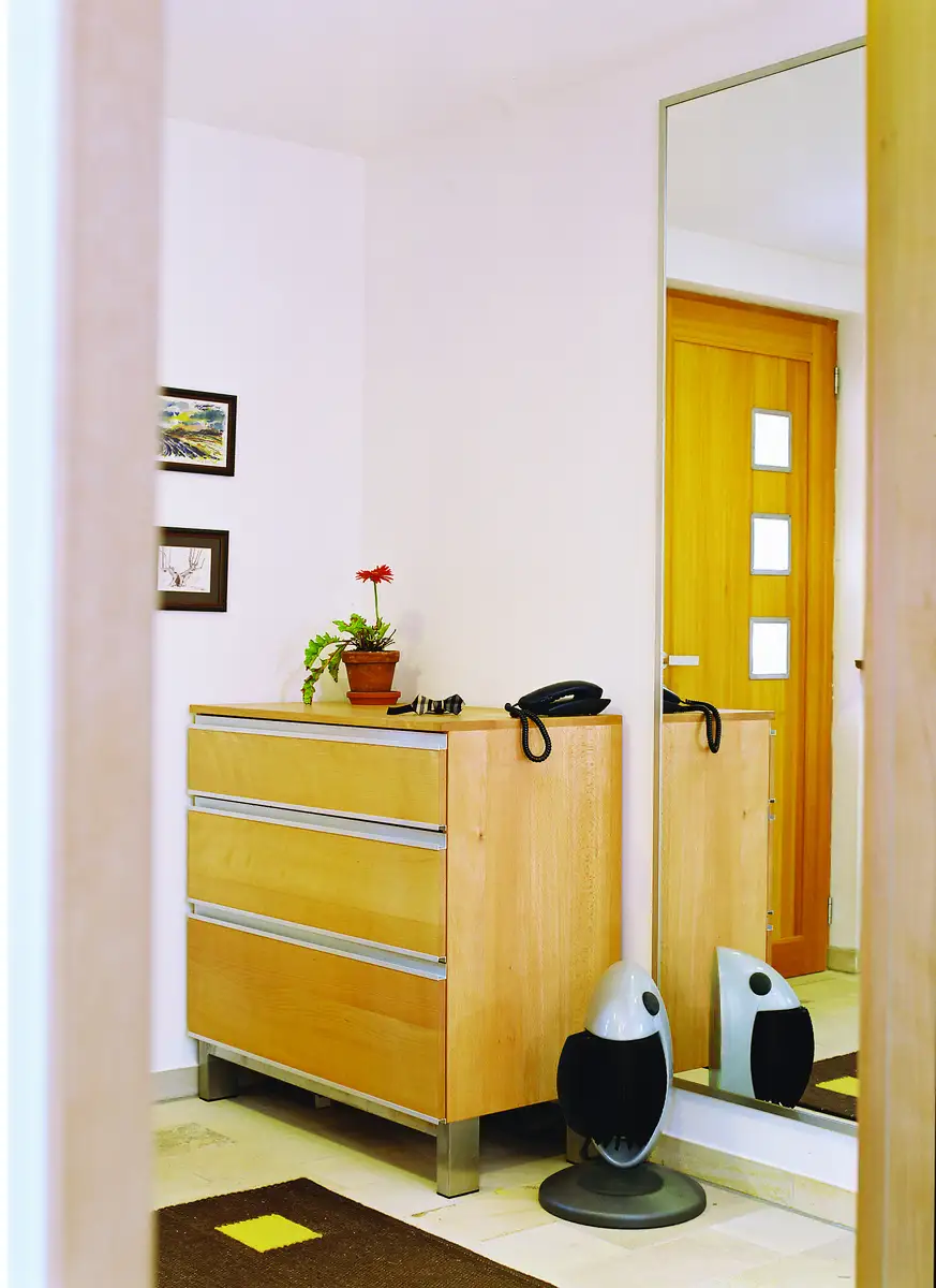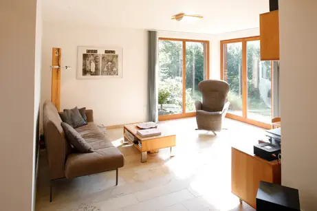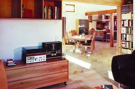Die Diagonale ist die längste Sichtachse im regionalen Musterhaus. Vom Backofenhochschrank in der Küche bis zu den Eckfenstern im Wohnzimmern sind es 16,5 Meter. Bis auf Sofa, Relaxsessel und die Hifanlage hat sich in den 22 Jahren seit Bezug nur wenig geändert.