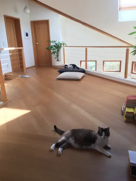 Es gibt im regionalen Musterhaus die Solnhofer Platte in bruchrauh im Erdgeschoß und im großen Bad, die beiden anderen Bäder sind weiß gefliest. Der Rest ist der von uns eingeschnittene und gefräste Dielenboden aus dem Holz der Hersbrucker Alb, verlegt vom Möbelmacherteam, hier Simone.