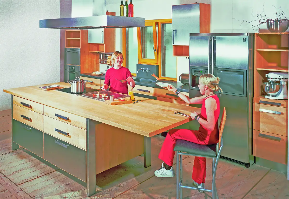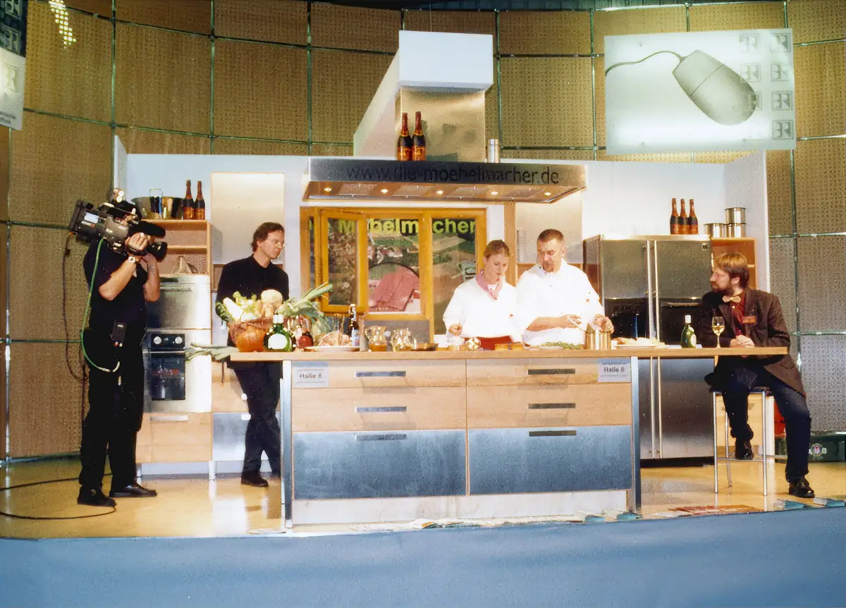 Das Küchenfoto in unserer Ausstellung aus dem Jahr 2000 ganz oben ist dem von 2024 ganz unten recht ähnlich, nur kam in diesen Jahren noch ein Mensch dazu, zu dessen Kochkursen für die französische Küche im Jahr 2035 wir schon heute einladen.