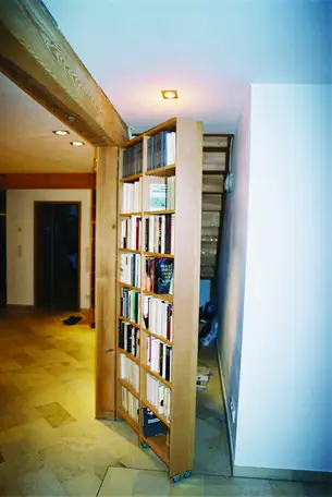 Den Stauraum unter der Treppe kann man nutzen, weil sich das Bücherregal mithilfe von Scharnieren und einer Rolle ganz leicht öffnen lässt. Über diesen Stauraum freuen sich vor allem Baufrauen und -herrn, die keinen Keller haben.