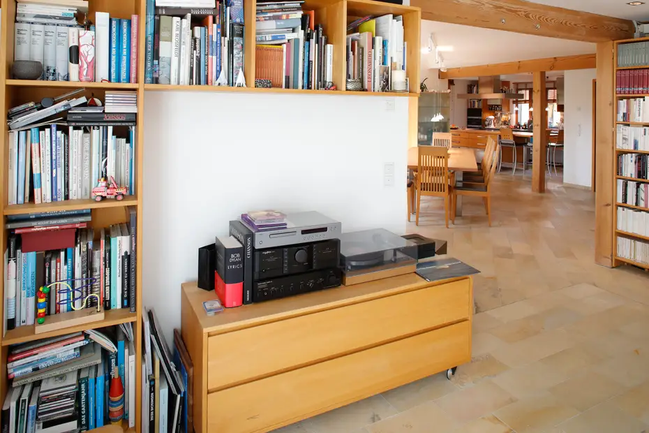 Das Wohnzimmer ist mit 440 mal 380 cm der kleinste der drei mit Küche und Essplatz verbundenen Räume. Oberhalb und seitlich des Rollis für die Hifianlage nimmt ein sehr tiefes Regal die Schübe für die CDs, die Schallplatten und vor allem alle Kunstbücher auf, die nicht in die Bibliothek passen, weil deren Maße jenseits aller Buchnormen sind. Ein Sofa, ein Sessel (nein zwei, weil ich meinen durch den neuen meiner Frau nicht ersatzlos streichen lassen wollte) ein Couchtisch reichen, einen Fernseher wollen wir hier nicht, weil er die Ruhe beim Kochen (abgesehen von der Musik) stören würde.