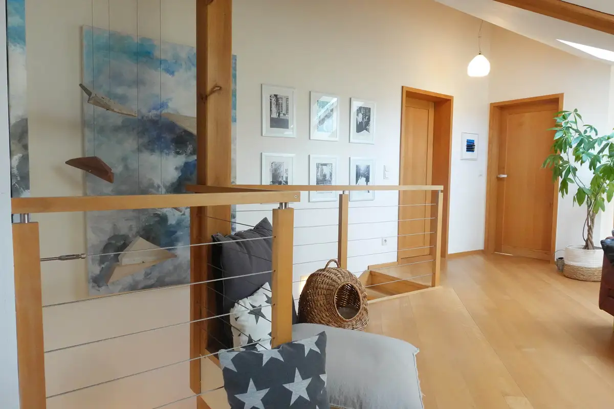 Die offene Galerie über dem Essplatz nimmt in der Zwischenzeit auch ein Sofa auf, das gar nicht so selten genutzt wird (was wir nie dachten). An der Balkendecke hängen Stahlseile, die Edelstahlböden als Bücherregal tragen. Die Fachböden waren damals bei unserem Hersteller für Lochblech übrig und so eine ebenso ästhetische wie preiswerte Lösung für Bücher.