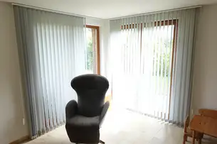 Wir haben extrem viele unterschiedliche Fenstergestaltungen eingebaut, die ein wenig beschatten, aber die Räume nur ein wenig abdunkeln können, wie zum Beispiel die Flächenvorhänge im Schlafzimmer, Holzjalousien in Küche und Bad, Vertikalanlagen im Wohnzimmer, Raffrollos im Gästebad und dem Hauswirtschaftsraum. Als das Enkelkind dann aufgrund anderer Gewohnheit in seinem Zimmer in Paris bei uns regelmäßig zu früh aufwachte, montierten wir verdunkelnde Plissees, die den Tag wirklich stockdunkel machen.