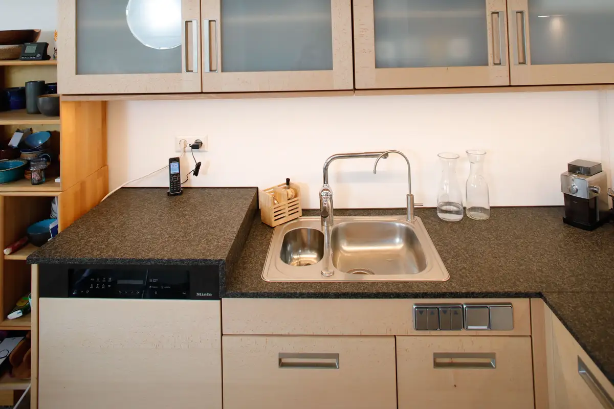 Die Granitplatte bedeckt auch die Spülmaschine und deren Seite