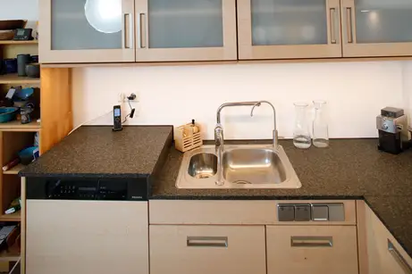 Die Spüle ist ein Spezialmodell, das eine nur sehr geringe Spülentiefe aufweist, weil man sie so im Sitzen viel besser bedienen kann