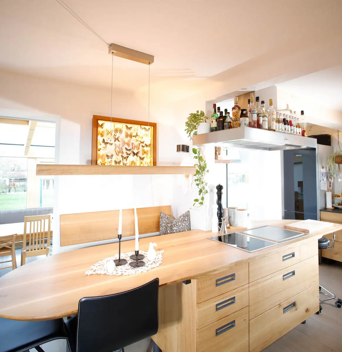 Dieser Grundriss über zwei Räume ist eher ungewöhnlich, umsowichtiger ist die sorgfältige Einarbeitung in die Planung. Die geplante Rieseninsel hat sich später zum absoluten Lieblingsplatz im ganzen Haus entwickelt. Wie schön, wenn man sich beim Planen dank der Einzelanfertigung an keine Kataloge halten muss: Alles, was uns gemeinsam mit den Kunden einfällt, ist auch verwirklichbar, denn wir haben eine moderne Massivholzschreinerei, die alle Ideen in Möbel verwandelt.