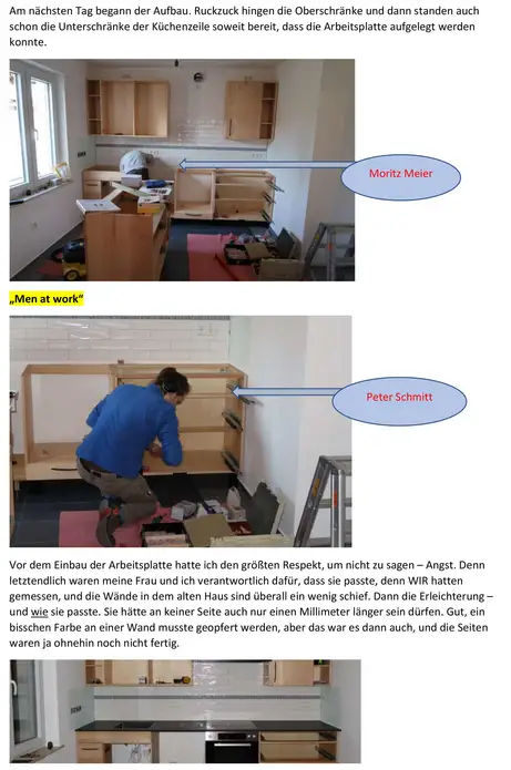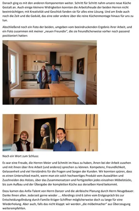 „Ihnen allen ein riesengroßes Dankeschön für Ihren Einsatz, Ihre Ideen, Ihre Geduld und die jederzeit enge Kommunikation. Und für das Mutmachen in den Phasen, in denen wir uns schon verloren sahen, im Chaos unseres Renovierungsprojekts, das uns mehr als einmal über den Kopf gewachsen war. Die Herausforderung war ja, in einem wirklich kleinen Raum eine schöne und möglichst vollwertige Küche unterzubringen. Und das ist trotz aller Kompaktheit gelungen.“