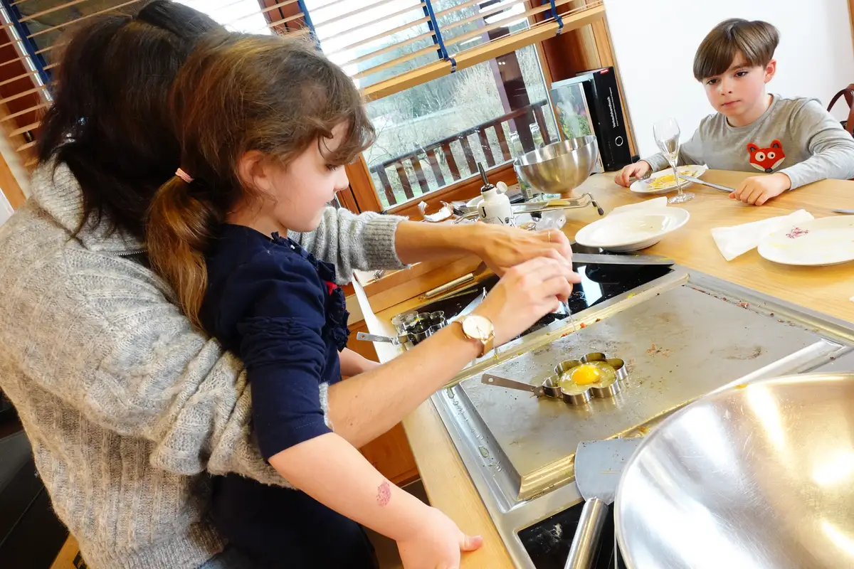 Beim gemeinsamen Planen der vielen Möglichkeiten wird dann irgendwann auch gekocht, denn dazu sind die Küchen ja auch da. Das eigene Ausprobieren ist immernoch die beste Methode, um Geräte kennenzulernen. Frieda und Felix (aber auch deren Eltern) freundeten sich auf diesem Weg bereits mit ihrer neuen Küche an, natürlich bekam sie die gleiche Ausstattung mit Tepan Yaki, Druckdampfgarer, Tellerwärmer und Co.