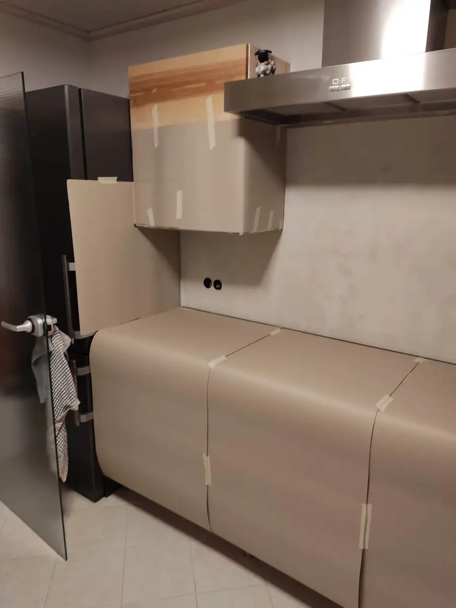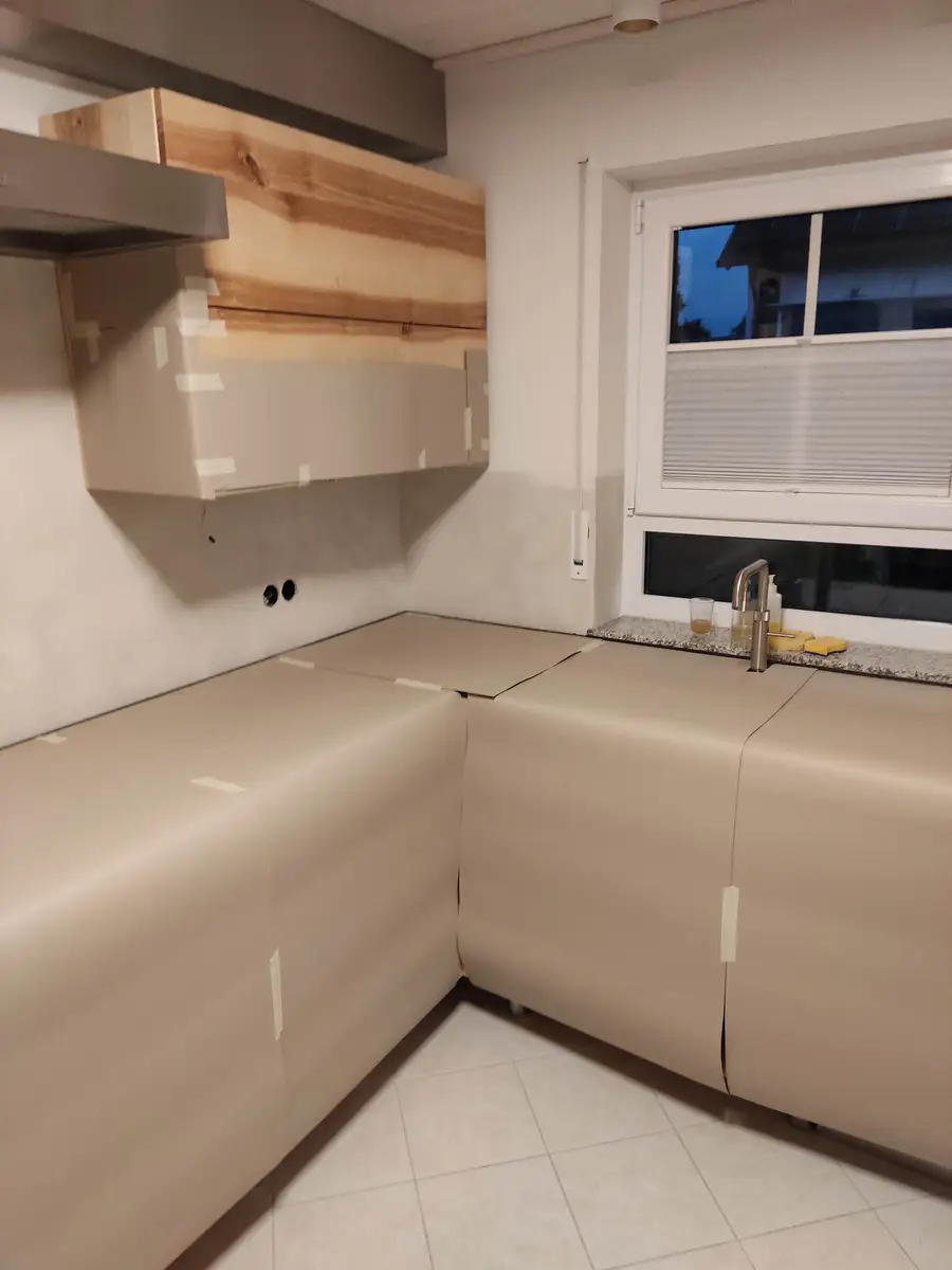 Wer sich so sehr in seine neue Küche verliebt, will nach der Küchenmontage beim Fliesenlegen keine Überraschungen riskieren. Im Video wurde weiter oben ja schon ein gewisser Respekt vor Massivholz deutlich (das wesentlich unempfindlicher und pflegeleichter ist, als von unseren Kunden befürchtet). Aber auch dem Fliesenleger kann bei dieser professionellen Abdeckung nichts daneben gehen (wir kennen bisher keinen einzigen Fall, bei dem dem Fliesenleger ein Malheur auf Kosten des Holzes oder anderer Küchenelemente passiert ist).